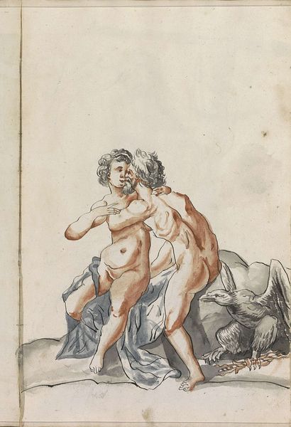 Curator: Looking at this drawing, I'm immediately struck by the somewhat melancholic quality of it despite the playful subject matter. The colors are muted, and the figures, though active, have a sense of being caught in a dream. Editor: I find the arrangement particularly engaging. Here we have Hendrick van Beaumont’s “Putti spelend met een Januskop” dating to 1696, a watercolor drawing showcasing a cluster of cherubic figures interacting with a Janus head. It’s intriguing to note the intersection of classical mythology and Baroque sensibilities here. Curator: Absolutely. Janus, the two-faced Roman god, represents beginnings, transitions, and duality. These putti playing with his head might be interpreted as grappling with the complexities of time and choice, or perhaps childhood innocence confronting the weight of adulthood. What a complicated emotional symbology. Editor: Precisely. During the Baroque period, such allegorical representations were prevalent, often employed to convey moral or philosophical concepts. This drawing likely served a didactic purpose, perhaps within an aristocratic household, subtly instilling classical knowledge. Curator: I also wonder about the physicality of it. They seem almost suspended in this ethereal space. Is that intended, I wonder, to communicate some tension or lightness in this scene? The Janus head appears heavy; they're really working to keep it elevated! Editor: It's fascinating how the art market conditions of the time also play a role here. Watercolors were appreciated for their immediacy and suitability for private collections, reflecting the tastes and aspirations of a growing elite class in the Netherlands eager to embrace classical motifs but not yet ready to do it through monumental commissions. Curator: It adds another layer of interpretation. So these playful putti aren't just figures from mythology; they also represent societal values and class dynamics of their time. I'll never see art the same way again after viewing this. Editor: Indeed. Art acts as both a mirror and a window, showing not only what the artist intended but what society valued, revealing much about both the past and our present moment as interpreters of that past.