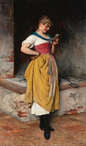 Émile Munier created "At The Fountain" using oil on canvas. The painting uses the classical technique of sfumato to soften the gradations between color. The dark green background highlights the figure of a young girl. Her form is softened by the blurred edges, which create a sense of depth and volume. The textures are smooth, but there is a slight roughness that adds depth to the painting and creates a three-dimensional effect. Munier's use of light creates a sense of movement and dynamism, drawing the eye across the composition, from the girl’s face down to the fountain. This not only adds visual interest, but also invites you to contemplate ideas of youth, innocence, and nature, presented through a carefully structured and formalized lens. Ultimately, the artwork becomes more than just an image; it is an exploration of form and content.