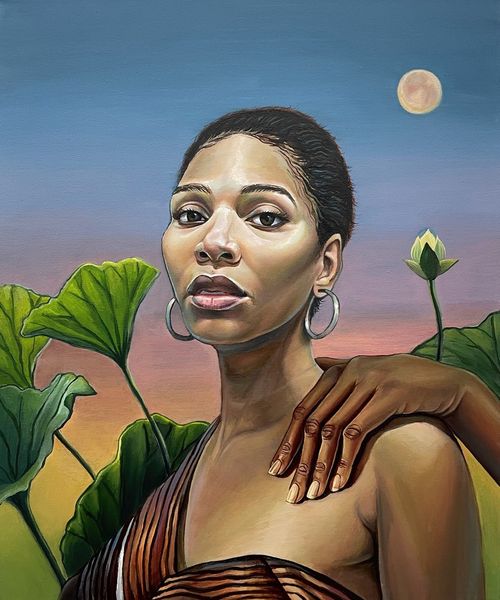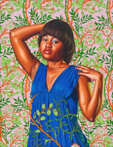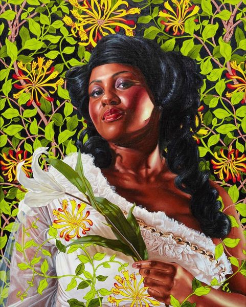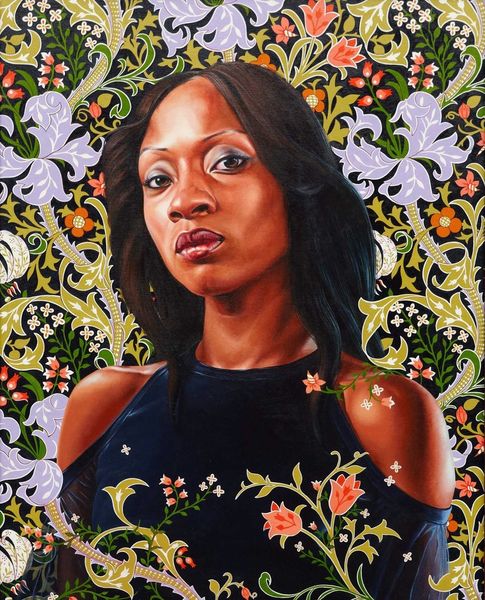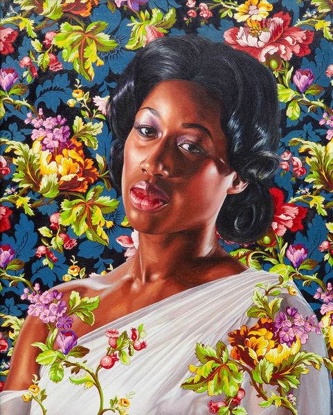 Kehinde Wiley made this painting, Dacia Carter, but when? It feels timeless, really. The colors in the background are so lush and layered, it's like a jungle of leafy patterns. Looking closely at her face, you can see the paint is applied so smoothly, almost like porcelain, which contrasts with the wildness of the botanical wallpaper. I love how Wiley uses this traditional portrait style, then throws in these vibrant, contemporary twists. See the way the light hits her cheekbone? The white fabric of her gown drapes around her, adorned with its own floral patterns that pop against the leafy backdrop, it gives me a feeling that's romantic but also a little bit confrontational. This reminds me a bit of Lynette Yiadom-Boakye's figures, who also claim their space with a quiet power. I think this painting invites us to rethink how we see beauty, power, and history, all tangled up together.