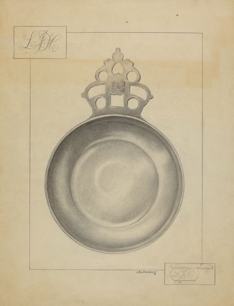 Editor: This is Charles Cullen's "Pewter Porringer," made around 1936. It's a pencil drawing on paper of what looks like a metal dish. The shading makes it feel so three-dimensional. What do you see in this piece, considering its history? Curator: Well, beyond the object itself, I'm immediately drawn to the context of its creation. This isn't just a still life; it's a drawing, a representation. It reminds me of the Index of American Design, a New Deal project that employed artists to document American decorative arts. Do you notice the almost technical draftsmanship, including what appears to be a cross-section schematic at the bottom right? Editor: Yes, I see that little technical drawing. It makes me think it's more than just an artistic rendering. Curator: Exactly. Consider the politics of imagery. The Index aimed to define and preserve a sense of American identity during a time of great economic hardship. Documenting everyday objects like this porringer was a way to value the craftsmanship and traditions of ordinary Americans. The museum becomes a storehouse for national values. Does knowing that affect your perception of the drawing? Editor: Definitely. It makes it less about just the pretty dish and more about celebrating a collective past. I can see how it connects to larger cultural narratives. Curator: Precisely! And that seemingly simple pencil drawing becomes a document imbued with social and political meaning, reflective of the role of art institutions during the Depression. This artwork demonstrates the value of democratizing our perception of what objects can hold meaning in a particular time. Editor: That's really insightful. I never would have looked at it that way initially. Thanks for broadening my perspective.