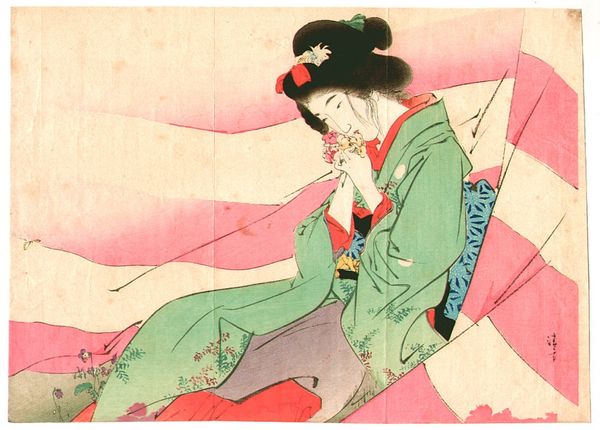 Editor: This is Tsukioka Yoshitoshi's print of Ichikawa Danjuro IX as Musashibo Benkei, a figure from the play "The Subscription List." I'm struck by the vibrant floral patterns and the controlled tension in Benkei's hand holding the scroll. What symbols do you see embedded in this image? Curator: Benkei's scroll represents knowledge and authority, but it's more than that. Consider the actor's determined expression, the way his robe is patterned: he embodies courage. The flowers are not merely decorative; they speak to the ephemerality of life. Yoshitoshi reminds us that even heroes face mortality. Editor: That's insightful. So the flowers are a memento mori? Curator: Precisely. And Benkei's strength isn't just physical. It's about navigating a world with grace, aware of life's fleeting nature. Editor: This really deepens my appreciation for the symbolism within this work. Curator: Indeed; symbols echo through time, shaping our cultural memory.