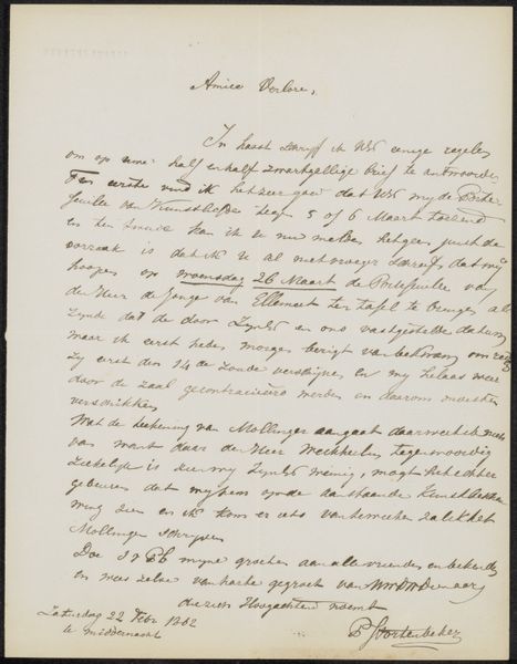 Curator: I’d like to introduce "Brief aan Pieter Verloren van Themaat," a piece held at the Rijksmuseum, possibly dating from 1862 to 1863. The work combines ink and pen on paper. Editor: The letter's handwriting immediately gives me a sense of urgency and intimacy, like a whispered confidence across time. The calligraphic strokes lean forward, full of a nervous energy. Curator: It's remarkable how much character is conveyed through handwriting, isn't it? The pressure of the pen, the slant of the letters... considering it’s just ink on paper, Stortenbeker is creating so much more. Editor: Precisely. Letters become vessels not only of news and information, but of feeling and, yes, even social standing. Who could read and write legibly speaks volumes to that. Curator: There’s a specific flow to the text; almost a rhythmic structure that resembles formal script. Stortenbeker had obviously dedicated his work to the art of crafting an elegant letter to be sent over long distances by horse. It’s so different from how we write and text now. Editor: Think about the labor involved – creating the ink, preparing the quill, practicing penmanship, finding the words, knowing your symbols. Today's mass communication is created almost unconsciously, it seems, on plastic keyboards, where script is a matter of font style, not personal expression. Curator: That's a stark but accurate contrast. This letter reveals so much intentionality, whereas our rapid-fire communications, although efficient, sometimes feel disposable. I imagine Pieter would be distraught by digital communication; it erases the individual character! Editor: Perhaps. It makes one wonder what future archaeologists will make of our texts and emails. Will they detect as much about us from those traces as we discern from Stortenbeker's letter? I mean, what will remain as evidence from current cultures? Curator: A fascinating question indeed! Exploring artifacts and archives help reveal more about ourselves and the culture we leave behind for generations to analyze in the future.