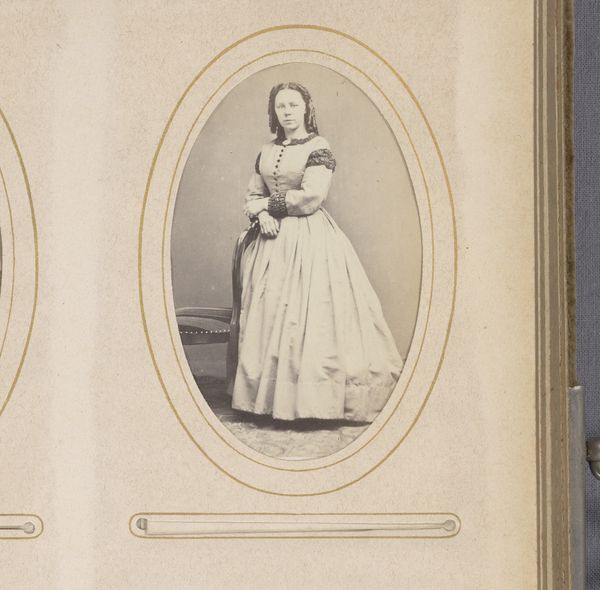 Curator: This portrait, known as "Portret van een zittende vrouw met pijpenkrullen," dating from around 1860 to 1900, presents an intriguing figure. What strikes you first? Editor: The tightness. The woman's pose—arms crossed so rigidly, shoulders hunched—coupled with the almost monochrome palette gives it a reserved, almost mournful quality. Curator: Precisely. The composition certainly enforces that impression. Observe the formal, contained pose; the tight oval vignette further restricts the subject, directing focus squarely onto her face and expression. Editor: And I wonder what constraints the photograph, as a relatively new medium, placed on its subjects? The stiffness we see might be less about emotional reservation and more about the technical limitations of long exposure times. This highlights the social and economic forces which determined who could participate in image production at this time. Curator: An astute observation. The medium itself undeniably shapes the message. Consider the delicate balance of light and shadow, the subtle textures captured despite the limitations, like her hair curls or even the weave of the dress. Editor: The staging feels very deliberate too. Notice how much visual real estate is dedicated to her dress? Her voluminous skirt becomes emblematic of the socio-economic status attainable for women through marriage at that time. Curator: The visual impact, regardless of the reason for such presentation, undeniably invites contemplation about its subject and context. The photographer's choices clearly invite reflection and, potentially, judgment, from contemporary society toward the depicted woman. Editor: It is hard not to see her beyond our contemporary expectations and sensibilities about visibility and representation in the public realm. And, the constraints of image-making placed on many at the time certainly challenge us to contemplate this work's historical context. Curator: Indeed, even just analyzing these specific elements heightens our engagement with not only what we perceive, but also how the visual construction reflects particular beliefs of the era. Editor: Definitely; these insights around this photography serve to ground us in a deeper historical understanding of it.
