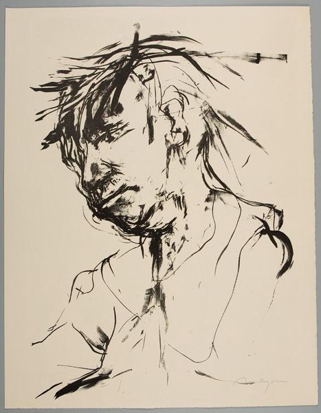 Editor: This is Michael Mazur’s "All the Work I Do Is in My Neck," Plate XIII, housed at the Harvard Art Museums. The frenetic lines make me feel a sense of anxiety and strain. What do you see in this piece? Curator: Note how the artist uses charcoal to create a strong contrast between light and shadow. The distorted features and the agitated mark-making contribute to the overall feeling of unease. It’s through these formal elements that the emotional weight is conveyed. Editor: So, the artist’s mark-making and use of light are central to the work's emotional impact? Curator: Precisely. The composition guides our eye and dictates our understanding of the subject's inner turmoil. The tension between representation and abstraction creates a visual metaphor for the work referenced in the title. Editor: That’s fascinating; I'll definitely pay closer attention to the formal qualities from now on.