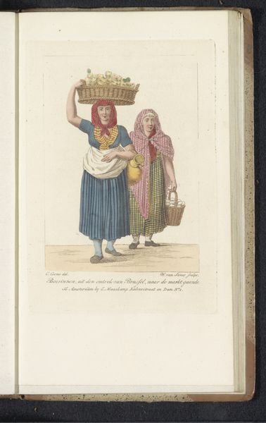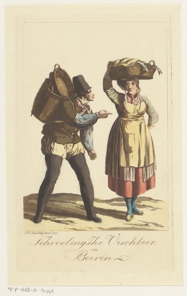 Editor: This watercolor, "Vlaardingse visserstypen," from 1816 by Jan Anthonie Langendijk Dzn, depicts what seems to be a fisherman and a fisherwoman. I’m struck by the artist's attention to detail in rendering their clothing; it seems almost ethnographic. How do you interpret this work? Curator: This work, made in the Romantic era, exemplifies a growing interest in portraying ordinary people. These weren't simply portraits but representations of types, almost like actors playing a role. It makes me consider the public role of art here; were these images intended as records, or something else? Editor: That's interesting. "Types"—so you're suggesting they aren't just individuals, but representatives of a particular group or community? Curator: Precisely. The Dutch were grappling with their national identity at this time after the Napoleonic period. Images like this, displayed in public exhibitions or reproduced as prints, contributed to shaping ideas about Dutch character, about who *they* were. Does the setting give you any hints? Editor: I see. I don't notice a clear setting—the background is pretty minimal. Maybe this wasn't about location specifically? Curator: Exactly! This neutrality suggests that this image is not so much a landscape genre scene as it is an exploration of social identities and cultural representation, packaged neatly for the consumption of the urban middle class in particular. Editor: That gives me a different perspective. It's less a slice of life and more a constructed idea about that life for outsiders. I hadn't thought about the socio-political forces at play. Curator: These images don’t merely *reflect* society, but participate in its making. It leaves me thinking about the visual politics embedded in supposedly straightforward depictions of "everyday life."
