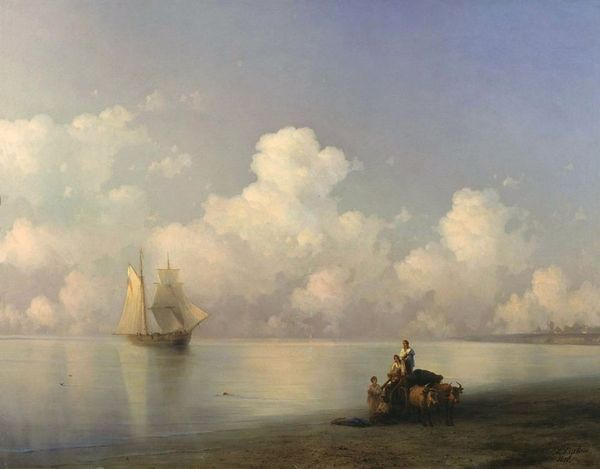 Editor: This is "Calm Sea. Landscape with fishermen," painted by Ivan Konstantinovich Aivazovsky in 1887, using oil paint. I find the overall impression so tranquil, almost ethereal, with the hazy light. What pulls you into this particular seascape? Curator: Well, it whispers to my soul, truly. The canvas sings of Aivazovsky's ability to capture light; it's less about realistic representation and more about evoking a feeling, wouldn't you agree? It's like staring into a dream. That diffused light, almost pearlescent, combined with the minute detail of the figures hints at the immensity of nature. Have you noticed the brushwork? Editor: Yes, the subtle variations in color create such depth, even in the calmest parts of the sea. It feels almost impressionistic. Curator: Exactly! Though rooted in Romanticism, Aivazovsky dances with Impressionistic techniques. What is interesting is his unique use of light which many artists from that period share. Imagine the salty air, the gentle rocking of that tiny boat... can you feel it? For me, that's art achieving its highest form. Editor: It definitely transports you. The little boat really accentuates the grandeur of the ocean, a perfect metaphor of man vs nature. Curator: Precisely. There is drama but mostly serenity. A masterclass, no? Editor: Absolutely. It’s much more complex than it initially seems; I didn't catch all the nuances. Curator: That is the beautiful thing about art; the conversation never ends!
