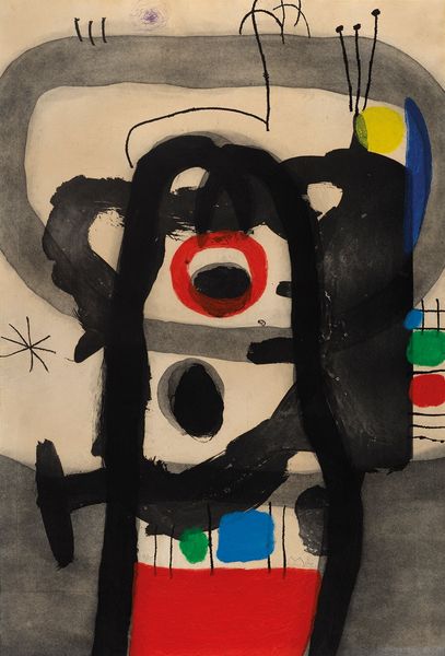 Curator: Noriko Saito's "Summer Sky," held here at the Harvard Art Museums, presents a captivating tableau of symbols and textures rendered on a canvas measuring roughly 81 by 72 centimeters. Editor: Wow, it feels like looking at a childhood dreamscape, doesn't it? All these floating figures and bold shapes... slightly unsettling, yet playful. Curator: The work's strength, I think, lies in its enigmatic character, its ambiguity. Saito's blend of abstraction with recognizable imagery—a figure, a sun, perhaps—invites multiple interpretations. The mark-making itself feels significant. Editor: I agree. It's like piecing together a story from fragments. The stark contrast of black and white, punctuated by that bright yellow and blue, really grabs your attention. It's as if Saito is painting a language we haven't quite learned to read yet. Curator: Precisely, and in doing so, she perhaps provides a commentary on how we construct meaning, both individually and collectively. It’s through grappling with these fragmented visual cues that a viewer actively becomes complicit in creating meaning. Editor: It makes me think about the summer skies of my childhood, how they were filled with endless possibilities and imagined creatures. There's something universal in that yearning for connection and understanding, isn't there?