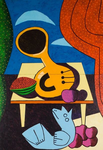 Louis Marcoussis painted this still life, featuring a guitar, fruit, and distant landscape, with gouache on paper. At its heart lies a ripe fruit, halved to reveal its seeds, a motif echoing the ancient symbol of fertility and regeneration, seen across cultures. Consider its lineage: from the pomegranate offered to Persephone in Greek myth, a harbinger of cyclical rebirth, to the Christian symbolism of seeds representing spiritual growth. Here, the fruit sits alongside a guitar, an emblem of harmony and creative expression. The window in the background evokes Caspar David Friedrich's Romantic landscapes, where nature serves as a mirror to the soul. Note that the window frames are painted in green, a color of transition that links the conscious world of the still life with the infinite realm of creative vision.