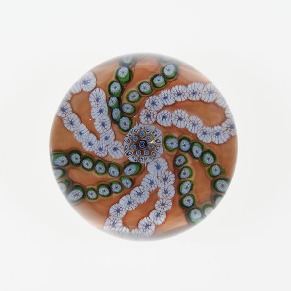 Editor: So, this is "Paperweight" from Compagnie de Saint Louis, dating back to the 19th century. It’s made of glass. The swirl pattern, almost floral but very geometric… it feels both calming and a little mesmerizing. How do you interpret this work? Curator: This seemingly simple paperweight exists at the intersection of industrialization, decorative arts, and the rise of consumer culture. Considering its purpose – holding down papers – it’s interesting to think about the democratisation of literacy in the 19th century, when printed materials became more widespread. Editor: I see what you mean. It is like this humble object signifies this historical shift. Curator: Exactly. The intricate glasswork also reflects advances in technology. Yet, unlike high art that often serves a purely aesthetic or intellectual purpose, this has a functional aspect linked to domestic life. Does that give you pause when thinking about class distinctions during that period? Editor: Yes, because mass production meant it was more accessible. Yet it's obviously beautiful craftsmenship, indicating higher end consumption too. So, even an everyday object became implicated in displays of status and taste. Curator: Precisely. Also, its circular shape and geometric designs invite associations with concepts of harmony, balance, and, potentially, ideas around control and containment – relating back to this function of suppressing or holding papers down. What does that trigger for you? Editor: Fascinating. It’s almost like this tiny, decorative object holds a lot of social weight when viewed through this lens. Curator: Right. Seeing decorative arts in this way highlights how gender, class, and technology influence artistic creation even outside the conventional high-art canon. Editor: I'll never look at a paperweight the same way again.