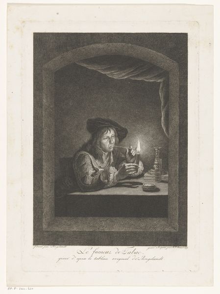 Gottlieb Welté created this intriguing etching of a scholar reading by lamplight. Notice how the globe is placed on the floor, a symbol of worldly knowledge, now cast aside in favor of the book's wisdom. The scholar’s posture, head resting heavily on his hand, evokes a timeless motif of melancholic contemplation. We see echoes of this pose in ancient depictions of philosophers and, centuries later, in Dürer’s "Melancholia I," where the figure embodies intellectual frustration. This gesture transcends mere sadness; it speaks to the burden of knowledge and the endless quest for understanding that weighs on the human spirit. The dim light, a flickering beacon in the darkness, further underscores the isolation and introspection inherent in the pursuit of wisdom. Consider how this symbol has been resurrected, transformed, and imbued with new significance across diverse eras. This image resonates with a deep, subconscious understanding of intellectual struggle.