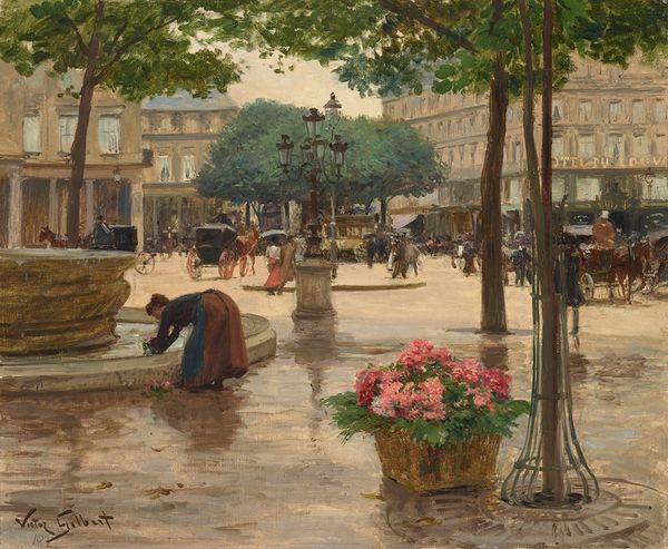 Here, we see Pierre-Auguste Renoir’s "The Grands Boulevards," an oil on canvas painting with no specific date. The canvas presents a bustling Parisian street scene, characterized by fluid brushstrokes and a vibrant, light-infused atmosphere. The composition is structured through the use of vertical elements, like the trees and lampposts, that frame the horizontal expanse of the boulevard. Renoir employs short, broken brushstrokes to capture the fleeting moment, suggesting movement and the transient nature of urban life. The light plays across the scene, creating a sense of depth and airiness. Notice how the color palette is dominated by soft greens, blues, and whites, which evoke a feeling of harmony and serenity, while touches of red and black add contrast and visual interest. Renoir’s work here isn’t just a depiction of a place; it's an exploration of the interplay between light, color, and form. The painting’s real subject is the act of seeing itself, how visual perception can be shaped by the artist’s subjective experience. In prioritizing sensory experience, "The Grands Boulevards" exemplifies the Impressionist focus on capturing the ephemeral qualities of modern life.