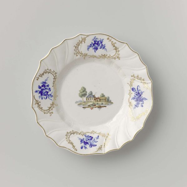 Curator: Welcome to this charming piece of ceramic art. This is a painted plate created in Loosdrecht around 1782-1784. The object features a delightful scene of poultry within a landscape setting. Editor: My first thought is how incredibly delicate and ornate it feels. The scale is intimate, and the painting on porcelain... you can almost feel the craft, the meticulous labor involved. Curator: Precisely! These porcelain pieces from Loosdrecht speak volumes about the social history of the time. Loosdrecht, attempting to compete with Sèvres, served an elite clientele keen on demonstrating status through refined possessions. It shows the cultural significance of ornithological interests through imagery. Editor: Right, because it wasn't just about consumption but about display—the materials signal something very specific about that class's ability to accumulate wealth and dictate style. This painting, rendered so precisely in watercolor on this expensive material speaks of leisure, almost in every brush stroke. What’s most intriguing to me is how high-art techniques and themes merge with what would otherwise be functional ceramic design. Curator: Absolutely, and this interplay affects the item’s reception. Rococo’s influence is prominent, a style favored for courtly representation which, even here, gives the artwork its lighthearted mood, its almost theatrical scene. It evokes the kind of artificiality appreciated in those decades. Editor: Artificial, but labor-intensive, right? You see the gold rim along the edges too—the decoration suggests highly specialized labor that most simply couldn’t access. This isn't merely decoration. It's value—value produced and carefully curated, telling us something very pointed about the social structure. Curator: An excellent point! This plate not only carries a picture but equally communicates power. And beyond this plate, porcelain production affected everything around it, from the sourcing of materials to complex systems of trade and craft knowledge. Editor: Exactly, and examining pieces like these really underlines the role materiality played. So, it asks who got to dictate "good taste" then and, maybe more importantly, who gets to do that now? Curator: It's a pertinent thought. This modest plate truly expands into greater historical contexts when closely considered. Editor: Absolutely. It pushes you to look past the immediate, to grasp the production that gave objects meaning.
