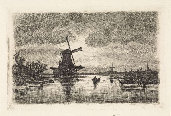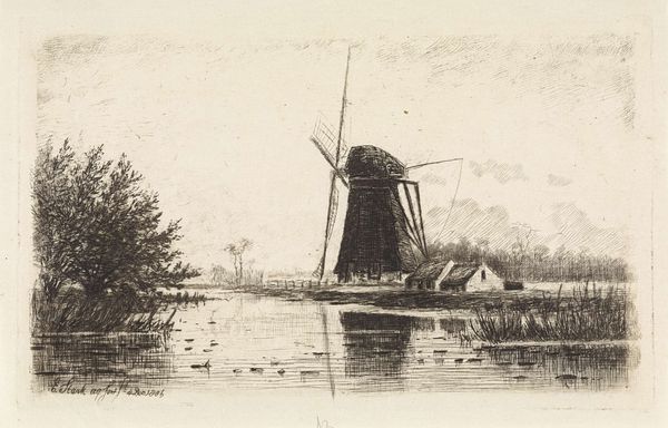 Jacobus van Gorkom Junior made this etching of a Dutch landscape with a canal and windmill sometime in the mid-19th century. The image captures an idealized vision of the Dutch countryside, one in which nature and technology exist side by side. The scene's visual codes point to the Netherlands' unique geography and its historical reliance on windmills for land reclamation and economic activity. The windmill, dominating the landscape, symbolizes Dutch ingenuity and the nation's ongoing struggle against the sea. The canal reflects the importance of water management to Dutch identity and prosperity. The scene does not engage in any social critique and is comfortably conservative, reinforcing national pride and celebrating existing social and economic structures. To understand this image better, we can consult historical archives, economic reports, and art criticism from the time. Considering the social and institutional context is essential to understanding how art reinforces particular visions of national identity.