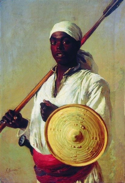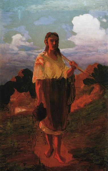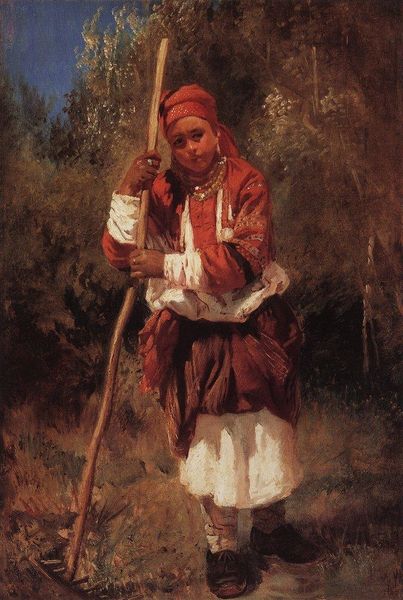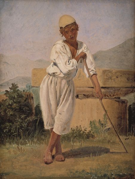 Curator: Standing before us is Camille Pissarro's "Woman Carrying a Pitcher on Her Head," painted around 1855. Editor: My first impression is of stark simplicity; the woman’s figure is solid, monumental against the pale, almost bleached landscape. The palette seems very limited. Curator: Indeed, Pissarro has focused on capturing the essence of the figure within its setting through simplified forms and a restrained color scheme. Notice how the lines of her body echo the gentle curves of the hillside behind her. The composition divides neatly into zones, earth below, sky above. Editor: The rough brushstrokes give an immediacy, as though we’ve caught her mid-stride. It's not romanticized. I'm curious about the material reality – what was the societal role of the people carrying these large loads, and where exactly did Pissarro encounter this scene? This must have been a physically taxing activity; what sort of access did the artist have that gave him the opportunity to paint this. Curator: The very act of painting is critical to the image here; the materiality of the paint on the canvas contributes to this effect. It is neither entirely illusionistic, nor entirely abstract. I am reminded of certain Post-Impressionist conventions and theories of pictorial space. Editor: But looking closely at how that clay pot was created by hand, what does that say about the traditions and craft knowledge involved? Pissarro gives it the same level of detail and brushstrokes that he employs in the figure and the landscape: an egalitarian representation. The background figures feel distant and anonymous while all our focus goes on this main subject. Curator: Pissarro certainly eschews traditional hierarchy within genre paintings and achieves a delicate balance and compositional tension throughout, achieved via diagonals cutting across compositional balance. The realism with which he depicts this subject offers visual delight alongside thoughtful commentary on structure and composition. Editor: Yes, that’s a great observation. Thinking about the clay and the cloth used, everything feels intimately linked to labor, and to necessity, speaking of the lives that relied on the utility of simple objects. Pissarro found an important intersection there in a work that balances labor and materials. Curator: Thinking of structure, it would also have had an emotional appeal because of how his eye chose the line of the silhouette to be the center, and then the balance. It really is all there, waiting for an audience to receive the effect and find a point of entrance and pleasure within the frame. Editor: I found myself looking deeper into how we engage with images and materials to reveal complex dimensions and create these different angles through which art may function. Thank you.