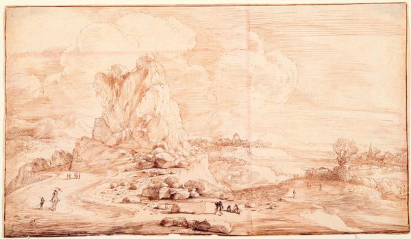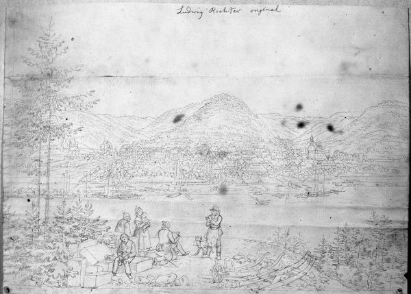 Editor: This is Adrian Ludwig Richter's "View of Tetschen." It's a detailed pencil drawing from the 19th century. I'm struck by how this landscape seems to capture a specific moment of industry and labour. What do you see in this piece beyond the idyllic setting? Curator: I see a portrait of labour and social hierarchy embedded within the picturesque landscape. The figures working near the boats – who are they? What class do they belong to? Richter presents an opportunity to interrogate how labour and landscape aesthetics intersect. How does his portrayal reflect or challenge the dominant narratives of 19th-century industrialization? Editor: So, it’s not just a pretty view, but a commentary on society? Curator: Precisely. It makes us question whose stories are being told and whose are being erased in these seemingly innocent landscape depictions. Editor: I'll never look at a landscape the same way again!