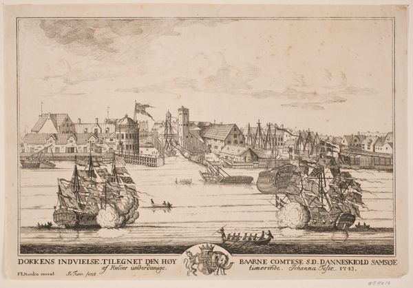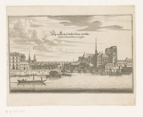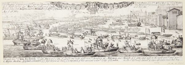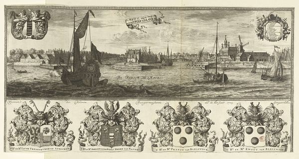 Curator: Ah, the industrious serenity of Amsterdam! This engraving, simply titled "Gezicht op Amsterdam, gezien vanaf de Amstel," or "View of Amsterdam from the Amstel," was likely created between 1683 and 1700. It’s a cityscape, likely anonymous, now held in the collection of the Rijksmuseum. What's your first impression? Editor: The whole piece hums with detail, doesn’t it? It's so crisp, like a well-ordered dream of a bustling port. Everything is incredibly balanced: light and dark, land and water…Even the text at the bottom acts as a foundation. And those chubby little angels with their banners, such a Baroque touch! Curator: Precisely. The angels, cherubic messengers, aren't merely decorative; they’re vehicles of symbolic communication. These billowing banners display Latin text that celebrates the civic virtues and prosperity of Amsterdam. Editor: I see it. Like advertisements dropped from the heavens! But tell me, beyond the surface, does it convey a particular feeling? Curator: I sense civic pride interwoven with mercantile ambition. Amsterdam, in the late 17th century, was at its Golden Age zenith. The composition celebrates the city's role as a vibrant center of trade and enlightenment. The architecture itself embodies this confidence, as those gothic towers project themselves proudly skyward. The artist shows the city both as it appears to the eye, as well as its conceptual framework as the 'ideal' city. Editor: "Civic pride," I like that. Though I wonder if that level of detail suggests something else entirely; like the artist and those in the market for a print might be saying, 'Look what we've made, let us now never forget it!' Curator: An apt point! Printed images served not only an aesthetic purpose, but became a vital instrument for memorializing identity at various levels; personal, political, cultural. In that vein, I agree it subtly nods towards something beyond mercantile pride, perhaps gesturing towards future generations in awe of past achievements. Editor: It's definitely given me a new appreciation for cityscapes; perhaps their continued popularity throughout history means people need not simply depictions, but a kind of map, a record of the values held, reflected in our choices. Curator: A fittingly insightful perspective. It seems that even in its calculated visual rhetoric, this seemingly straightforward view onto Amsterdam hints at multiple layers of meaning.