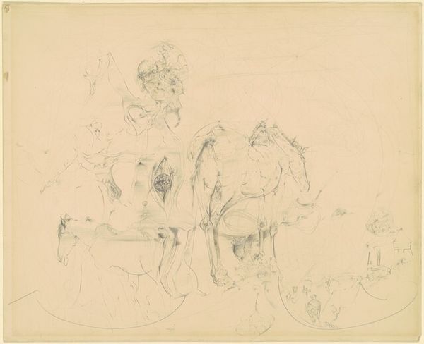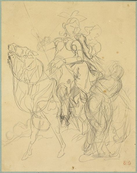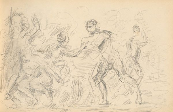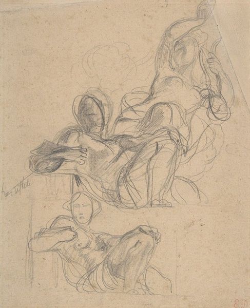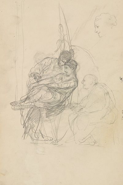 Editor: Here we have Henryk Siemiradzki’s pencil sketch from 1883-84, "Study of Andromeda and figures with a Swan-drawn Chariot for the ‘Andromeda’ ceiling in the Palace of J. Nechayev-Maltsev in St. Petersburg.” It's so light and airy. What strikes you most about it? Curator: What intrigues me is how this seemingly classical sketch operates within the context of 19th-century Imperial Russia. Siemiradzki, celebrated for his academic art, was nevertheless participating in the visual rhetoric of power. These sketches aren't just about aesthetics; they’re about legitimizing a certain social order. How does this connect, perhaps problematically, to the Andromeda myth itself? Editor: Problematic how? It just seems like a beautiful drawing to me, I’m not sure that I see any connection to any power dynamics. Curator: Think about Andromeda's narrative: a princess chained and offered as a sacrifice. Consider, too, that 19th century Russia, while modernizing, was deeply patriarchal. Is there a way this visual glorification, even in sketch form, implicitly normalizes or aesthetically justifies subjugation of marginalized identities by an aestheticization of the feminine form, like Andromeda’s figure in this study? And furthermore how this act can reflect the aesthetic consumption of art for male consumption in that period? Editor: Wow, I hadn't thought about it that way. Seeing it connected to power dynamics really does give it a whole new dimension. Is it right to feel a little uneasy looking at it now? Curator: Unease is good. It means you're critically engaging. Recognizing the social and political layers within seemingly straightforward artworks encourages deeper understanding and dialogues. Editor: I definitely learned a lot by looking past the immediate beauty of the image. I will remember this context going forward.