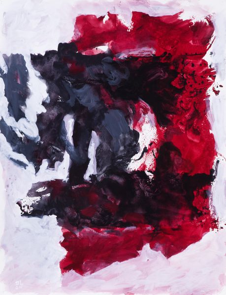 Editor: Here we have Rene Duvillier’s "Dragonne célibataire mariée" from 1999. It looks like it’s made with a mix of acrylic paint and ink, with some areas of really thick impasto. It’s… intensely pink, and chaotic, almost unsettling. What’s your take on this piece? Curator: Well, the title itself, "Single Married Dragon," is immediately suggestive, isn't it? Considering this was created in 1999, we can look at the societal shifts regarding marriage and individuality. This artwork, through its clashing, almost violent application of paint, speaks to the push and pull of those identities. It rejects the traditional, harmonious presentation of relationships. Do you see how the central form is both struggling to emerge and dissolving at the same time? Editor: I do, it’s almost like something’s being born but also destroyed. Curator: Exactly. The vibrant, almost aggressive pink dominates, a color often associated with femininity, love, or even anger. This, coupled with the gestural abstraction typical of that era, allows Duvillier to question established social structures and perhaps, express a sense of personal struggle through his work. Do you think it achieves this? Editor: Definitely. It challenges viewers to confront the complex, often contradictory, aspects of identity and relationships. It feels almost performative, challenging the conventions of marriage in society. Curator: Precisely. It offers a commentary on how personal identity gets negotiated in our society and in relationships, challenging norms via an assertive visual statement. Editor: I never would have picked that up initially. I was too distracted by the boldness of the colours! Thank you for sharing your insight, I definitely look at it differently now. Curator: My pleasure. Thinking about the broader context enriches the individual experience with the artwork.
