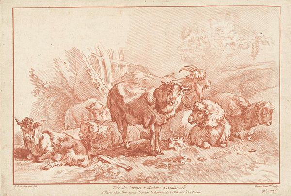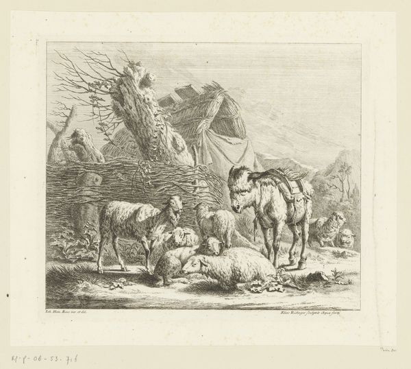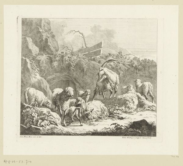 Johann Elias Ridinger created this print, "Herd of Cattle and Sheep," sometime between 1698 and 1767, using etching and engraving. During Ridinger's time, depictions of animals were often intertwined with notions of rural life, and sometimes served as allegories for social hierarchies. Think about the way the animals are arranged: the cattle, larger and more imposing, are placed prominently, while the sheep huddle together, almost as an afterthought. The scene presents a vision of pastoral life, yet it's also shaped by the power dynamics inherent in human relationships with the natural world. Consider the cultural context; animals, both then and now, often become stand-ins for human characteristics and social roles. How might these animals reflect societal values or power structures? Reflecting on these connections invites us to consider our own place within the complex tapestry of life.