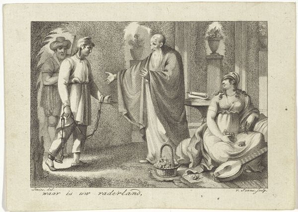 This print, Onderdanen bij een vorst, was made by Willem van Senus in the late eighteenth or early nineteenth century, using engraving – a printing technique where lines are incised into a metal plate, which is then inked and pressed onto paper. In this composition, the physical act of engraving becomes a kind of metaphor for labor. The fine, precise lines that define the figures and architecture demanded skilled craftsmanship, and a great deal of time. Yet, the print medium also makes the image infinitely reproducible. This tension between handcraft and mass production is key to the print's social context. It speaks to the hierarchies represented in the image itself – those kneeling before the king – but also reflects the changing status of craft in an age of emergent industry. Ultimately, examining the material and method helps us to consider the cultural values that Van Senus' print both embodies, and puts into circulation.