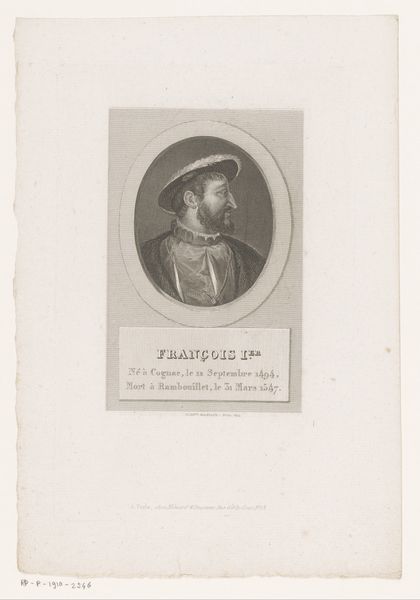 Curator: Immediately, I see the weight of power bearing down, the intensity is striking, a palpable anxiety. Editor: Let’s take a look at this Neoclassical print by Emile Giroux, titled “Portret van Filips VI, koning van Frankrijk,” placing its creation sometime around the mid-19th century. Curator: The stark monochromatic rendering feels a bit austere, yet…intimate? There's a vulnerability peeking through the regal facade. Editor: Given the period, this work functions within specific power dynamics. Notice how Giroux positions Philippe VI within this history through visual cues like his crown, robes and sword. These symbol are used to solidify the idea of divine power, a common trope in depicting monarchs. Curator: Yes, the conventional trappings of power, but look closer at his face! The way his eyes are cast downward, the subtle pursing of his lips. I see the conflict, the lonely burden of leadership, of carrying the hopes, fears and failures of an entire kingdom. Editor: And what does it mean to depict a king of France during a period defined by revolution, social change, and questioning the role of monarchy? There is something deeply unsettling here. What can feel like vulnerability in this image may speak to a larger project of legitimizing a position increasingly seen as indefensible at the time this work was made. Curator: Or perhaps Giroux saw him as a flawed hero, an individual trapped by circumstance? Isn't that where true understanding, true compassion lies, in acknowledging the messy humanity beneath the crown? Editor: It might also highlight the artificial nature of power. Perhaps Giroux invites us to consider who can wield the symbols of authority and how their relationship with this king might influence his decisions in service to the nation. It reminds us to challenge authority. Curator: Interesting points. Maybe both interpretations hold truth, a simultaneous nod to the man and a questioning of the system that elevates him. What do you see as the most important legacy of portraits of powerful historical figures? Editor: The way portraits like these offer a mirror to our present struggles and inform us of where we stand concerning ideas about power, equity, and access. Curator: I leave with that thought too, considering how that echoes through our time and challenges us to consider. Thanks.