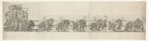 Albrecht Dürer created these pen and brown ink drawings, titled "Third and Fourth Span of Horses with Allegories," during the late 15th to early 16th century. These drawings are part of a larger series that Dürer produced for Emperor Maximilian I, reflecting the emperor’s desire to cultivate a public image as a powerful, enlightened ruler. As such, this piece serves as a Renaissance vision of power and authority, represented through classical allegories and symbols. Here, the muscular horses evoke strength, while the allegorical figures, bearing laurel wreaths, suggest triumph and honor. But consider the role of the figures leading the horses. Their bodies, though idealized, are subjected to the task of controlling the animals, thus subtly reinforcing a social hierarchy. This representation invites us to reflect on how power is not just displayed, but also enacted through labor and control. How does this depiction of power resonate with our contemporary understandings of leadership and authority? How do the figures in this drawing reflect or challenge the societal norms of their time, and perhaps, even our own?