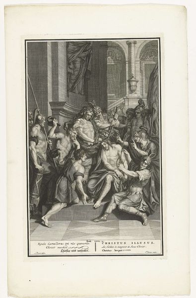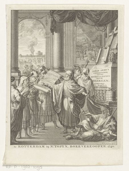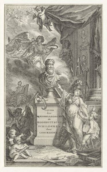 Curator: This engraving, dating from 1768, is titled "Briefschrijvende man onder toeziend oog van geestelijken" which translates to "Man writing a letter under the supervision of clergymen." It’s by Reinier Vinkeles, a Dutch artist known for his detailed historical scenes. Editor: Oh, wow, that's a lot to take in at once. My initial impression is just how... unsettling it is. The scene feels crowded and there's a kind of watchful tension in the air. I can feel the weight of the church breathing down that poor guy’s neck. Curator: Absolutely! The very process of engraving creates a sense of precision and control, which mirrors the control exerted by the clergymen over the writer. Notice the careful rendering of each line; it speaks volumes about the meticulous craftsmanship and time investment involved. These prints, reproduced en masse, would've brought Vinkeles both income and a voice to be reckoned with. Editor: Yes! It makes me think about the socio-economic context here. The piece acts like an exercise in visibility – showing labor, but also the instruments of labor: paper, ink, the printing press that disseminated this very image. There’s also those chubby cherubs wielding weapons in the lower register, I sense this piece acts as commentary of political power too. It's a battlefield in ink! Curator: Indeed, and while those cherubs appear almost whimsical, they could be seen as allegorical figures representing various factions or political entities involved in the history. In that respect it feels akin to looking through a kaleidoscope with a serious hangover. The religious and political power dynamic on full display! Editor: Looking at the material quality makes me consider this work as more than just a depiction of an historical scene. This act of mechanically reproducing art meant that new and more diverse groups of people could engage with these kinds of charged images. Each printed impression democratizing discourse… Curator: It becomes a dialogue, doesn't it? I initially felt only that tense pressure on the subject of the artwork, but considering how this piece reached the masses, I feel like the writer perhaps had the upper-hand after all. Editor: Exactly, through this image-making, even two centuries later, we continue to engage in the messy act of meaning-making and bearing witness.