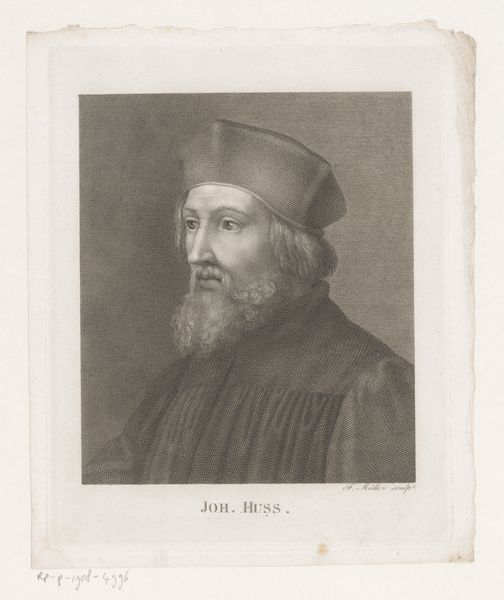 This portrait of Johannes Hus was created by Ernst Ludwig Riepenhausen using engraving, a process that demands precision and care. The image is made through painstaking work. The artist would have used a tool called a burin to manually incise lines into a metal plate. Ink is then applied to the plate, and after wiping the surface, ink remains in the engraved lines. Finally, the image is transferred to paper under high pressure. Consider the level of skill this requires; the artist's hand guiding the burin to create the fine lines and cross-hatching that define form and texture. This wasn't just a mechanical reproduction, but a labor-intensive translation of an image into a new medium. This emphasis on craft reminds us that even in processes that seem reproductive, human skill and judgment are central. It challenges distinctions between art and craft, revealing the artistry inherent in skilled making.