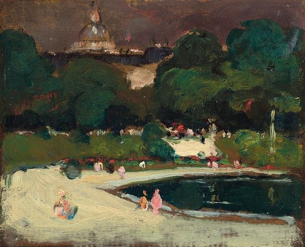 John Singer Sargent captured this scene, titled "In The Luxembourg Gardens," with oil paints, though the exact date is unknown. Sargent, an American expatriate, often depicted the leisure activities of the upper class, and here we see figures strolling through the Luxembourg Gardens in Paris. The painting invites us to consider the roles and expectations placed upon individuals within this social class. The women, with their elaborate dresses, embody a certain standard of femininity, while the men seem to conform to ideals of masculinity and power. Sargent's choice to paint this scene during twilight evokes a sense of melancholy. He invites us to reflect on themes of identity, social roles, and the subtle, underlying emotions that often accompany even the most picturesque moments. It captures both a sense of the historical moment and something more timeless about the human condition.