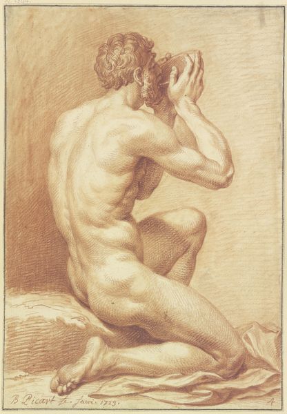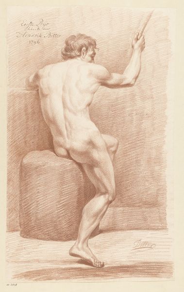 Editor: This drawing by Hendrik Voogd, titled "Seated Male Nude, Seen from the Back," possibly from 1785, is created using pencil. I'm struck by the detailed musculature and the raw physicality conveyed. What can you tell us about the historical and material context of this piece? Curator: Well, let’s consider the socio-economic context of 18th-century art academies. The labour involved in producing such a meticulous drawing would have been extensive. Think about the artist's access to materials – high-quality paper, pencils – commodities in themselves, indicative of a certain level of patronage or social standing. Editor: So, access to materials was indicative of social standing for the artist themselves? Curator: Exactly. But more than that, think about *who* is being depicted. The male nude, laboriously rendered in pencil – is this a celebration of human form, or is it about exerting power over that form through representation and possession? The labor of Voogd in production, is being put to the service of studying and mastering the body. Who gets to represent whom, and for what purpose? This isn't simply an innocent sketch; it’s laden with social and economic implications. Editor: It's interesting to think about art production itself as a form of labor, particularly in the 18th century and its association with economics. Curator: And even the ‘2nd prize’ mentioned in the title implies a hierarchy, a competitive market within the academy itself. The award is the symbolic prize, but in practice the artwork embodies economic exchange itself, the product and instrument of a stratified cultural economy. Now does that change how you look at this artwork? Editor: It does. It reframes my understanding. The material and labor aren't just means to an end; they're integral to understanding the art's function within a larger social framework. Thanks, that’s quite illuminating.