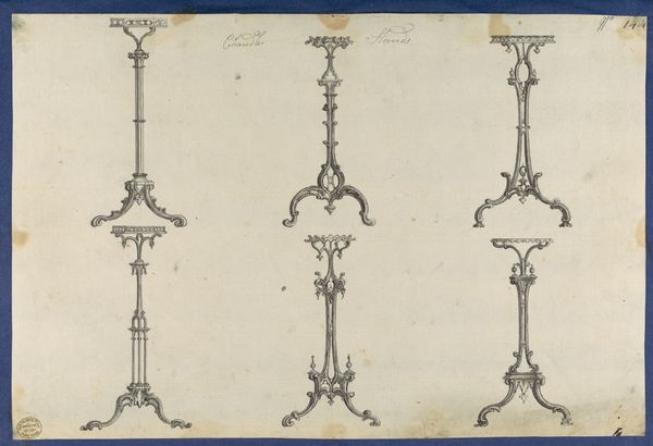 Editor: Here we have "Designs for Basin Stands and Teakettle Stands, in Chippendale Drawings, Vol. I," created in 1761 by Thomas Chippendale. It’s a drawing, or perhaps a print, on paper. Looking at it, I’m struck by the intricate linework and the clear classical influences. How would you interpret this work from a formalist perspective? Curator: This piece is fundamentally about the interplay of line and form. Chippendale meticulously delineates each element, showcasing a clear understanding of structure and proportion. Note how he employs symmetry to achieve a sense of balance, adhering to classical principles. Consider the variations in line weight—thick to define edges, thin to suggest interior detail. Does that emphasis on the *line* strike you as more important than its eventual utility? Editor: Yes, I think so! The designs themselves, while functional in theory, seem secondary to the elegance and precision of the drawing. The lines almost have a life of their own, irrespective of the object they depict. It is a captivating exercise in pure form, actually. Curator: Precisely. It’s a self-referential study in design. Notice, too, the use of negative space. The white of the paper becomes just as crucial as the drawn lines in defining the shapes. Do you see how the balance and relationship of those elements create visual interest? Editor: Yes, absolutely. The emptiness around the designs emphasizes their delicate nature and allows each stand to be viewed independently. What have you gleaned from the structure and layout that other visitors might overlook? Curator: Perhaps, the implied volume that he creates only through line and shading. While flat on the page, there’s a clear attempt to render them as three-dimensional objects. Look at how line and volume create texture and how texture contributes to the composition of the drawing. Editor: That makes perfect sense. I think I have a much better appreciation for the technical skill and design principles that underpin this work now. Curator: And I trust you also recognize the drawing less as a historical document or source of design than as a standalone visual structure.