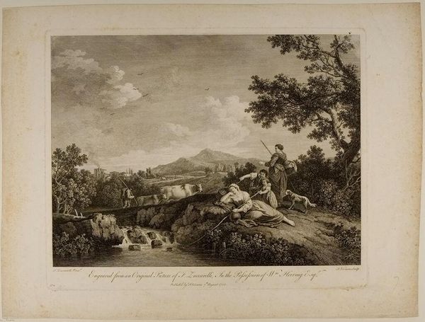 Curator: This is "Guinguette" by François Nicolas Barthélemy Dequevauviller. It's an etching; the dimensions of the image are roughly 24 by 33 centimeters. Editor: It feels a bit crowded to me, almost teeming with a restless energy. There's a lot happening within a limited space. Curator: It's capturing a social moment. A "guinguette," typically a working-class place for leisure, evokes a sense of community, especially in contrast to aristocratic life. Note the well, a gathering spot and symbol of common resources. Editor: Yes, and the etcher really uses a range of cross-hatching to model figures and create light and shadow. It’s controlled but conveys a lively atmosphere. Curator: Exactly. The slightly tattered building reinforces the theme of a humble, yet vital, social space. The architecture mirrors the lives of the people it houses. Editor: The composition really draws you in to see all of its details. A nice snapshot of a moment. Curator: It really captures a specific social class and their forms of gathering and leisure. Editor: Seeing the detail in the crosshatching and the variety of poses gives me a different perspective than just reading the title.