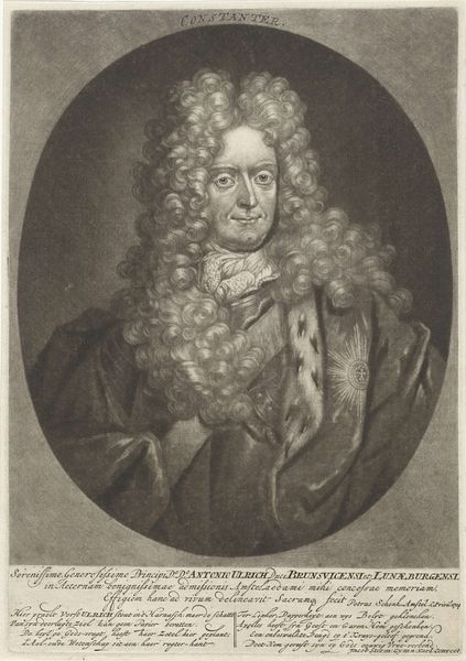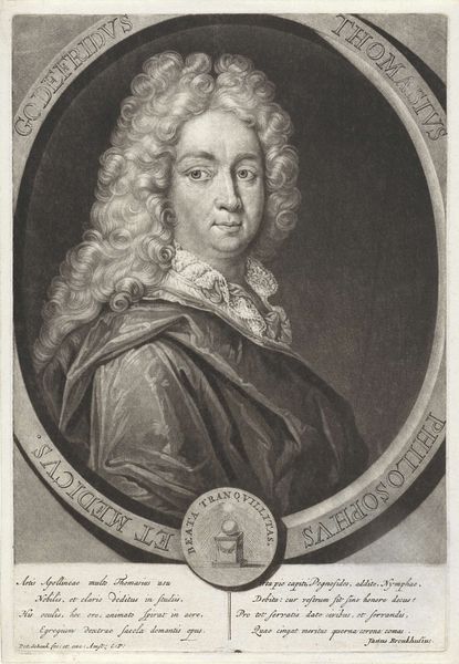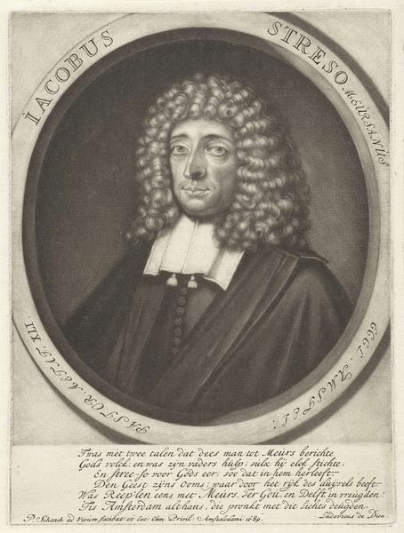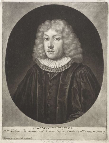 This is Pieter Schenk’s portrait of the theologian Benjamin Ursinus, made around 1705. The print captures Ursinus within an oval frame, his figure composed of intricate lines etched with remarkable precision. The eye is immediately drawn to the contrast between the dark, patterned robe and the delicate, almost ethereal quality of Ursinus’s face and wig. Schenk masterfully employs the texture of the print medium, playing with light and shadow to define form. The fine lines create a sense of depth and volume, especially in the cascading curls of the wig, which frame Ursinus's face like a halo. Look at how Schenk uses the contrast between the ornate details of the clothing and the relative simplicity of Ursinus's face to emphasize his spiritual authority. The use of the oval format flattens the picture plane. However, this aesthetic choice serves to intensify the gaze directed at the viewer. Ultimately, Schenk's portrait invites us to consider the relationship between surface appearance and the deeper, less visible aspects of faith and intellect.
