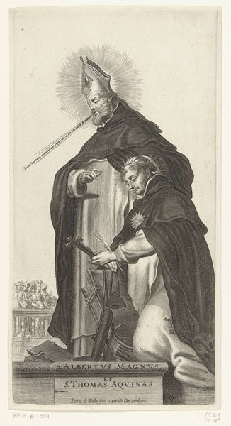 Curator: Looking at this striking Baroque print from between 1651 and 1676, held here at the Rijksmuseum, we see a portrait of Filips van Rouveen, rendered by Theodor Matham through the detailed technique of engraving. Editor: My initial thought is of restrained power. Even in the detailed rendering of an engraving, there's an undeniable sense of authority and a kind of somber grandeur emanating from this portrait. Curator: Absolutely, and that sense of authority would have been meticulously cultivated. These portraits served important functions within the social fabric. They project power but also piety. See how his coat of arms features centrally. Editor: Precisely. Beyond just identification, coats of arms always communicate layers of symbolic meaning about lineage, aspirations, and the specific virtues that the family wished to project. Notice too the cross he is holding. Curator: A fascinating point. It's not merely decorative; it's a staff, a symbol of leadership and spiritual authority. His hand gesture is deliberate, isn't it, like a benediction? Editor: Very much so, yes. Consider too, how the eye is drawn to his face; the details etched by Matham convey not only age but also, perhaps, wisdom gained through experience. It subtly guides the viewer into veneration. Curator: But, of course, all these visual signals had to adhere to the norms of portraiture during that time, ensuring the subject's status was properly represented. We also have to wonder who this print was made for, and who would've encountered it. Editor: A private devotional object perhaps, or maybe something circulated amongst his religious order? Given the care and detail evident here, it speaks to an intentional and considered approach to portraying the sitter. Curator: Well, that really has enhanced my understanding. It’s a print meant to influence perception within specific social spheres, reinforcing Rouveen’s authority within his community. Editor: And for me, too. Seeing the confluence of religious symbolism and calculated authority reminds us that imagery always operates on multiple levels.