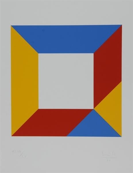 Maria van Elk made "Gevouwen vorm" which translates to "folded form", on paper. What I notice about this piece is its flat planes of simple shapes and cool hues. The blue square within a white square creates a serene yet structured visual experience. The texture of the paper is rough and tactile, especially around the edges. It reminds me of printmaking, where the impression of the block leaves its mark on the page. The blue square is opaque, solid, and unwavering. The mark making is not concealed, you can see the roughness of the printing process. In contrast, the surrounding white space feels lighter and more fragile. The blue looks almost collaged, it is so solid and yet contained. This contrast is reminiscent of Josef Albers' "Homage to the Square" series, in its exploration of color relationships and geometric forms. However, van Elk’s work has a quiet simplicity that feels very grounded and honest. It's a lovely meditation on form and process.