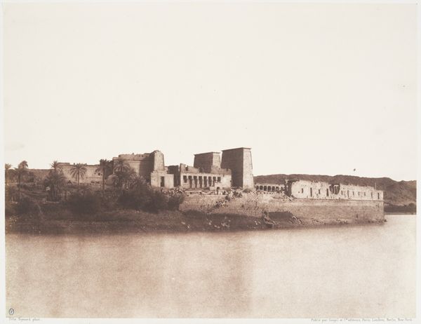 Félix Teynard captured this photograph, "Débôd (Parembole), Vue Générale des Ruines," using a calotype, a process known for its soft focus and tonal range. The composition is striking. Teynard divides the scene into distinct horizontal bands, from the dark foreground to the ruined temple, and then to the vast, almost bleached, sky. This structure creates a sense of depth and emphasizes the stark, geometric forms of the ruins against the natural landscape. The heavy sky adds to the desolation. The formal elements here reflect the early days of photography, where the medium itself was being explored for its capacity to document and represent reality. Yet, Teynard does more than simply record; he composes an image that speaks to the passage of time and the silent grandeur of ancient structures. Notice how the texture of the paper and the subtle imperfections in the print enhance the photograph's character, adding layers of meaning beyond the depicted subject matter. It's a meditation on history, memory, and the enduring power of form.