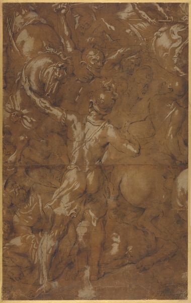 Editor: Here we have Aurelio Lomi's "The Banquet of Ahasuerus and Esther," created between 1595 and 1622, using ink on paper. It looks incredibly busy, full of figures in motion. What compositional elements strike you? Curator: Notice how Lomi constructs space not through linear perspective alone, but through the density of figures and the contrast between light and shadow. Consider how the architectural framework of columns and arches, while seemingly classical, is employed to compress the scene, intensifying the drama. What purpose might this serve? Editor: To create a sense of urgency, perhaps, or even claustrophobia? There's very little negative space; everything seems crammed together. Curator: Precisely. Note how Lomi manipulates the viewer’s gaze using directional lines created by the figures’ gestures. The hands, the gazes - they guide us through the dense crowd towards what appears to be the focal point, yet this is obscured, isn’t it? Where do you find your eye drawn, and why? Editor: I'm drawn to the right, to the figures with what look like crowns; they're slightly brighter, but partially cut off. The use of the sepia ink, too, creates a sort of tonal unity across the entire drawing despite all the activity. Curator: Yes, the monochromatic palette binds the diverse elements. We should also consider the dynamism achieved through the contrasting textures - the smooth, almost porcelain quality of some figures against the rougher hatching used to create depth and shadow elsewhere. Lomi masterfully employs these variations to enhance the overall effect. How does Lomi's ink application alter your perception of the figures? Editor: It gives them a very energetic, Baroque feel; very dynamic, less posed, like a snapshot of a moving event rather than a staged tableau. I see now how the artist compels the eye. Curator: Indeed. By analyzing the visual components, we can understand Lomi's capacity to evoke emotion and drama through the very language of line, tone and texture. It truly shapes how one engages with narrative.
