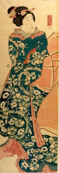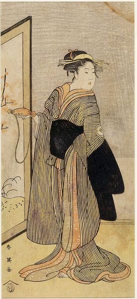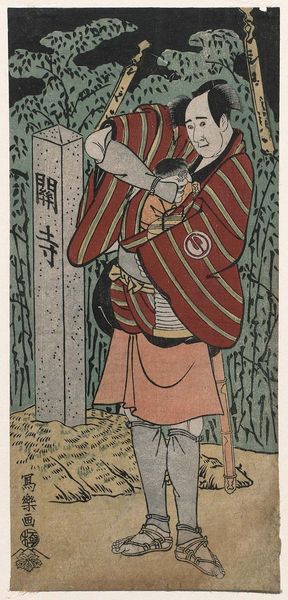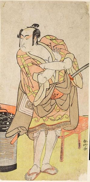 Editor: This is Katsukawa Shun'ei's "Actor Iwai HanshirÅ 4th as Tora." I'm struck by the contrasting patterns on the kimono. What do you see in this piece? Curator: The kimono itself is a rich repository of symbols. The birds, for example, are often associated with freedom, joy, and transition. How do they make you feel here? Editor: They seem poised for flight, contrasting with the static pose. Curator: Indeed. Note how the artist uses these culturally loaded images. They tap into a shared visual language, hinting at the character's inner life and aspirations beyond the stage. Editor: It's amazing how much meaning can be packed into these images. Curator: Absolutely, visual symbols can carry profound emotional and cultural weight, connecting us to cultural memory.