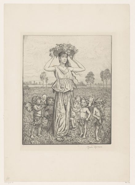 Curator: Ah, this piece entitled “Vrouw en twee kinderen met speelgoedwapens,” created around 1818 by Adrien Victor Auger, presents such an intriguing interplay of familial tranquility and militaristic undertones. It’s primarily an etching, although one can detect what appears to be pencil work as well. What are your immediate impressions? Editor: My first thought is how unsettling it is. The children with weapons and the somewhat listless mother present a really dissonant image of leisure, war, and familial representation all at once. Curator: Precisely! I find myself drawn to the craftsmanship itself – how the textures are achieved, how the tools were manipulated to render the varying shades, it feels indicative of printmaking production during that time period. There’s something almost democratic about the distribution of images, though clearly, the subjects here speak to privilege. Editor: And I think this supposed democratic spirit also clashes with the artwork. The mother figure's class position is not particularly critiqued or challenged in her role, at least ostensibly. Her positioning reinforces societal hierarchies where women occupy limited spheres, and the image appears as a confirmation of class divisions of its era. Curator: Yes, and those toys could suggest future power structures within families. Those seemingly harmless instruments represent the making and production of weapons that would sustain a global war economy for generations. The boy has his sword, and the little girl with bow and arrow, seem a nod towards the gendered roles within military society at that point in history. Editor: To continue this idea, and to underscore the art as not harmless entertainment, let’s unpack the image and what the presence of those objects tell us about constructions of boyhood, masculinity, and warfare during that period. Whose interests are being represented when we frame this as innocent "play"? What messages are being received when one sees an art piece where children are toying with weapons in idyllic spaces? Curator: I concur, and while considering its meaning we can not negate that it is itself an artifact, a testament to the industry of image-making. What choices of materials were used? The type of paper, and quality of ink...what does that communicate to audiences then, and now? Editor: That focus is incredibly valid. What I find enduring, and what feels pertinent even in today's world, is the way in which art can serve as both a window and a mirror, allowing us to examine, critique, and understand societal norms regarding childhood. I hope we see both sides. Curator: Agreed; art like this acts as a record to how industrial advancement also touches upon themes of childhood, privilege, power dynamics, all in the 19th Century context and of today. Thank you.