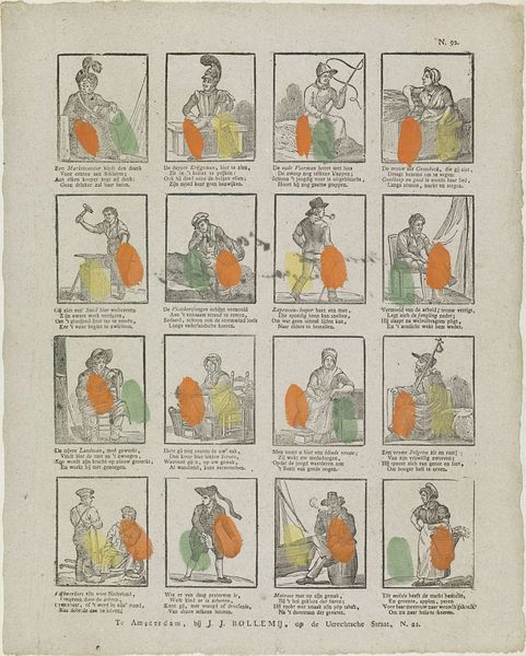 This print, “Ambachten en beroepen,” meaning crafts and professions, was made in Amsterdam. We don’t know the precise date or maker, but we can still glean a lot from its material character. The print is made from an inked plate, likely copper or wood, pressed onto paper. Notice the stark lines and the simplicity of the forms. This was not meant as a precious object, but as an affordable and reproducible item. Each of the small scenes depicts a different trade, from tailoring to butchering, giving us a glimpse into the world of labor in the early modern period. The print’s very existence speaks to a burgeoning economy, where images could be circulated and consumed. It’s a reminder that art is not just about individual expression, but also about the social and economic contexts in which it is made and used.