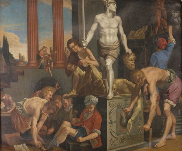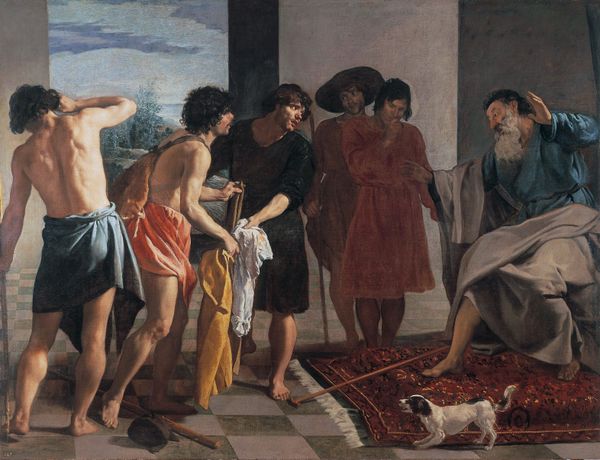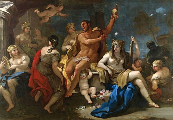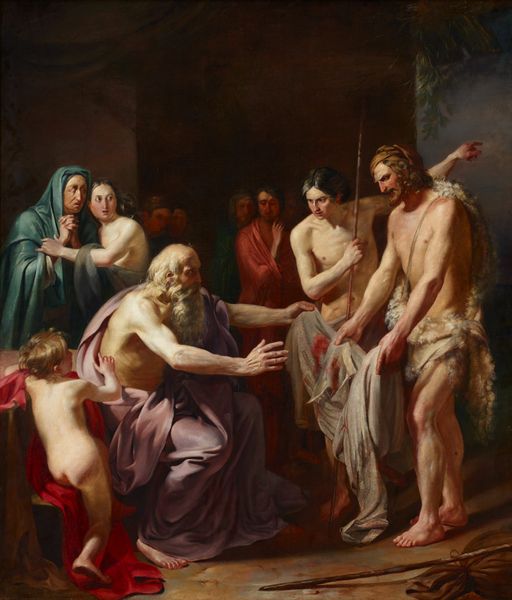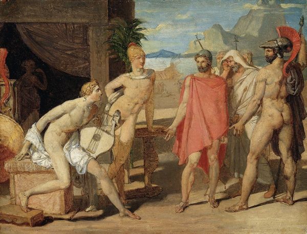 Editor: This is "Ambassadors Sent by Agamemnon to Urge Achilles to Fight," painted in 1801 by Jean-Auguste-Dominique Ingres. It's an oil painting, and it feels…staged, almost like a theatrical production. So, what kind of visual stories do you think Ingres is trying to tell here? Curator: Note how the figures seem deliberately arranged, almost like classical sculptures. Ingres is consciously evoking the visual language of ancient Greece, of course, and the idealized forms. How do these forms help convey a particular set of values? Editor: They do look like statues come to life. You mean values like heroism, maybe, or reason? It’s so different from the drama of Romanticism. Curator: Precisely. But look closer at Achilles. He is placed apart, and at his side is Patroclus. Notice anything significant about their posture, in contrast to the ambassadors? Their stance indicates refusal. What symbolic weight does Achilles’ rejection hold? Does it speak to pride, fate, or perhaps a critique of war itself? The visual language Ingres employs gives clues. Editor: I see it now. The ambassadors are literally extending their hands, begging, while Achilles is turned away. It’s powerful! Perhaps this reflects the futility of war when it’s driven by ego? Curator: Indeed. This scene becomes a mirror reflecting eternal conflicts and their enduring impact on the human spirit. What strikes me the most is the timeless quality – even though it’s referencing antiquity. Editor: This has revealed much deeper meanings than what meets the eye! Now I see there are hidden messages embedded through the symbolism and figures used. Thank you!