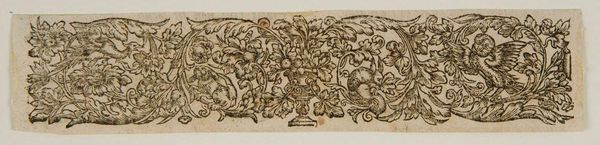 Editor: This is an anonymous piece called "Head-piece," its date is unknown, and it's held at the Harvard Art Museums. The intricacy of the line work is really striking. What do you notice about its visual structure? Curator: The composition is remarkable. The symmetrical arrangement of figures and foliage creates a sense of balance, yet the density of the detail prevents it from feeling static. Note how the artist employs both positive and negative space to articulate forms. Editor: So, the empty spaces are just as important as what's drawn? Curator: Precisely. They define the contours and enhance the overall legibility of the design. Did you observe the texture created by the varied line weights? Editor: I hadn't thought about that, but now that you mention it, I see how the lines create depth. Thanks, that really opened up my eyes to the artist's skill. Curator: Indeed, by focusing on these formal elements, we gain a deeper appreciation for the artist's vision.