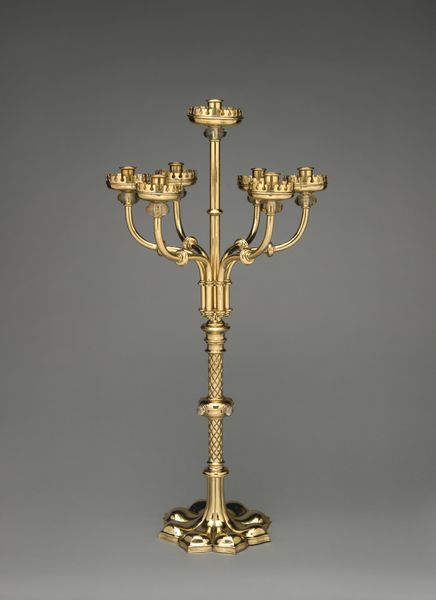 Editor: Here we have André Aucoc’s two-branch candelabra, crafted from silver sometime between 1887 and 1911. The intricate baroque style seems so excessive, even opulent, to our contemporary eyes. How might we interpret its cultural significance today? Curator: It’s a compelling question, particularly when we view it through the lens of class and power. Pieces like this weren't simply decorative; they were potent symbols of social status and economic dominance during a time of significant social stratification. How does the candelabra's overt display of wealth make you feel, knowing its historical context? Editor: I hadn’t considered it that way before. There's something almost unsettling about the lavishness when I think of it as a deliberate statement of social standing, particularly in contrast to those struggling during the same era. It makes me think of the 'Gilded Age' and all the implications of that term. Curator: Precisely. Think about the labour involved in creating such an object, the access to resources it signifies, and the statement it makes about who belongs and who does not. The Baroque style, revived during this period, can be seen as a way for the wealthy to connect themselves with a history of aristocratic power and excess. But how might it also be interpreted as a tool used to solidify their position, while marginalising others? Editor: That’s fascinating. Seeing it as a tool or argument for power…it shifts my whole understanding. I guess I was initially focused on its aesthetic qualities without fully engaging with its historical and social weight. Now I realize the art isn't separate from social concerns. Curator: Exactly, it's intrinsically linked. And this piece challenges us to reflect on the ongoing power dynamics in our society. Do such displays of wealth and luxury still function similarly today? Editor: Definitely something to keep thinking about! Thanks for opening my eyes to the deeper historical narrative embedded in this piece.