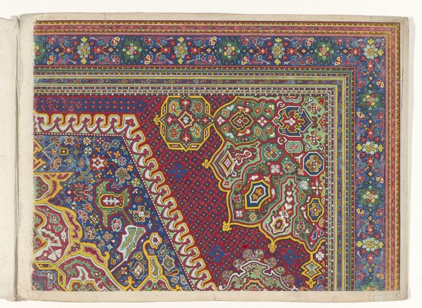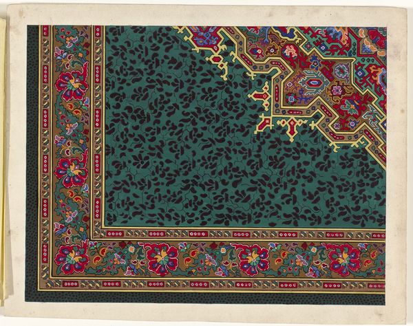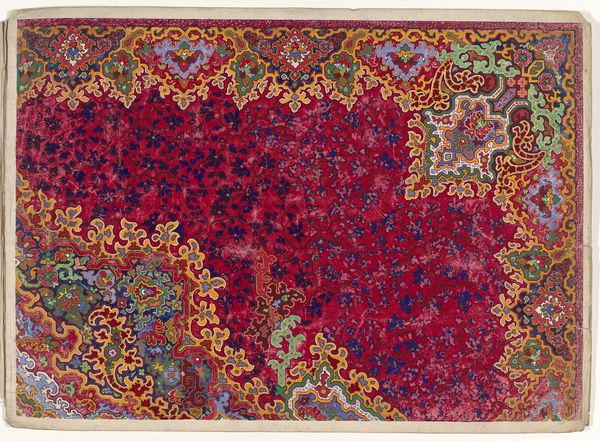 This is a design for a carpet, of unknown date and authorship, rendered with watercolor on paper. The intricate patterns and vibrant colors command immediate attention. A rich red field is bordered by a complex array of floral and geometric motifs, creating a visual texture that is both dense and dynamic. The structure of the design reflects a deep understanding of ornamentation, and the interplay between positive and negative space enhances the work's visual complexity. Each element contributes to the overall harmony, yet the lack of a clear focal point disrupts any conventional sense of order. The design challenges fixed notions of symmetry and balance, inviting a more fluid and interpretive experience. Ultimately, the carpet design operates as a semiotic system, where each motif functions as a signifier, contributing to a larger cultural narrative. The design destabilizes any singular interpretation, existing as a site of ongoing visual dialogue.