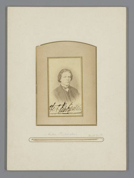 Editor: So this is a portrait of the pianist Anton Rubinstein, created sometime between 1880 and 1894, using photography on paper. It’s a pretty straightforward image, very formal, but something about his expression feels a little melancholy. What do you see in this piece? Curator: It's more than just a portrait; it’s a document reflecting the complex societal pressures and expectations placed upon artists, especially those from marginalized communities in late 19th-century Europe. As a Jewish man in Russia, Rubinstein occupied a precarious position. Consider how this photograph, likely commissioned to project a specific image, intersects with his identity. How much of "Anton Rubinstein" the person, do you think, is in the photograph, or does it serve the prevailing ideas of virtuosity? Editor: That's interesting. I hadn't thought about the way his identity might play into it. It's true, it's hard to see the man behind the image. What do you mean? Curator: Well, what elements stand out to you? The way he's dressed? His hair? Think about how carefully curated these details would have been to align with societal expectations of a successful musician, while potentially downplaying his Jewish heritage in a society rife with antisemitism. To me, it looks posed, calculated and controlled, and to be wary of power. Where and from whom did this power stem? Who was his audience? Editor: So, it’s almost a performance of identity, trying to navigate those different worlds? A tension between fame, artistic expression, and cultural assimilation? Curator: Exactly. Even his “melancholy” gaze, as you described it, can be interpreted as a quiet resistance, or perhaps the weight of these conflicting pressures. Think of it as a visual negotiation between self and society. What have you found most interesting about Rubinstein as we explored this piece together? Editor: I hadn't considered how much identity and social pressure could be embedded in what seems like a simple portrait. That gives me a lot to think about. Curator: Me too. Thinking about art as more than image has never failed to fascinate me.