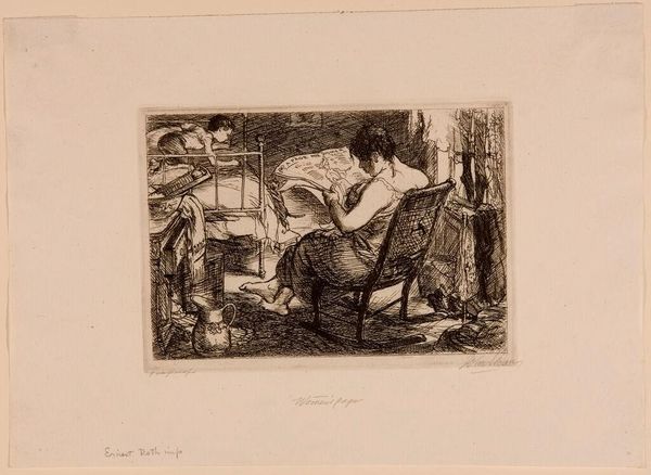 Editor: This is "Card Game" by W. Mezentseva. The medium looks like a woodcut or linocut. It feels like a somber scene, but also strangely intimate. How does this artwork speak to you? Curator: It reminds me of the social realism movement. The stark contrast, the focus on ordinary people, possibly reflecting socio-political issues of the time. How might the context of its creation influence its reception? Editor: That’s interesting. I hadn’t thought about it in terms of social commentary. So, the artist's personal experiences are reflected here? Curator: Possibly. Art is never created in a vacuum. The socio-political climate and public sphere can definitely shape its meaning. This piece encourages us to consider the artist’s role in society. Editor: I see. It makes me think about how art shapes society and vice versa. Thanks for your insight!