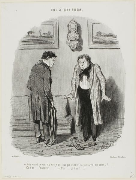 Curator: Honoré Daumier’s lithograph, "Man past te kleine schoenen," created in 1847 and housed at the Rijksmuseum, catches a very specific, relatable kind of frustration, don't you think? Editor: Absolutely! There's something universally understood in that grimace and flailing gesture. The energy practically leaps off the print. Is it just me, or is there something deeply theatrical in this composition? The lighting seems focused. Curator: It’s classic Daumier, using caricature to critique social issues, especially the middle class. Here, the tight shoes become a metaphor, perhaps, for the restrictions of bourgeois life. Think about the revolutions brewing across Europe at the time. This small inconvenience mirrors the larger discontent. Editor: I can see that. The exaggerated features definitely play into that reading. I’m thinking about contemporary resonance too. Consumerism comes to mind – the pressures to fit into a mold, or a size, that doesn't actually suit us. The expectation that one must buy something to belong is so harmful. Curator: And that resonates directly with Daumier's commentary on class. Consumption as a marker of status was a growing concern. What about the other man in the lithograph – almost in shadow, carrying other boots? Is he complicit or simply observing this spectacle of discomfort? Editor: Good point! The class element adds an entirely new perspective here. Is he in servitude? What choices were even offered to him? To contextualize it further, in his shoes, his body doesn’t reflect wealth and privilege but rather subjugation. The composition implicates class disparity within an act of simple, everyday consumerism. Curator: Right! And this print was made to be disseminated widely. Think of the power in distributing this criticism amongst the very people it targeted, allowing people the chance to view and consider classism, wealth, consumerism, and how that can negatively affect a community and even a sense of self. Editor: It really does speak volumes about Daumier's ability to capture both a moment and a movement. These "too-small shoes" are, in reality, crushing someone’s freedom. It’s all the more pertinent given the climate in Europe in that historical moment. Curator: Exactly! Daumier uses the everyday to unearth deeper, uncomfortable truths, which makes the piece as relevant today as it was nearly two centuries ago.