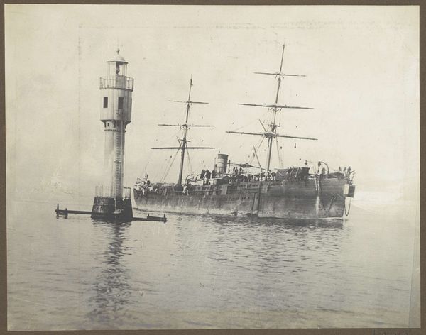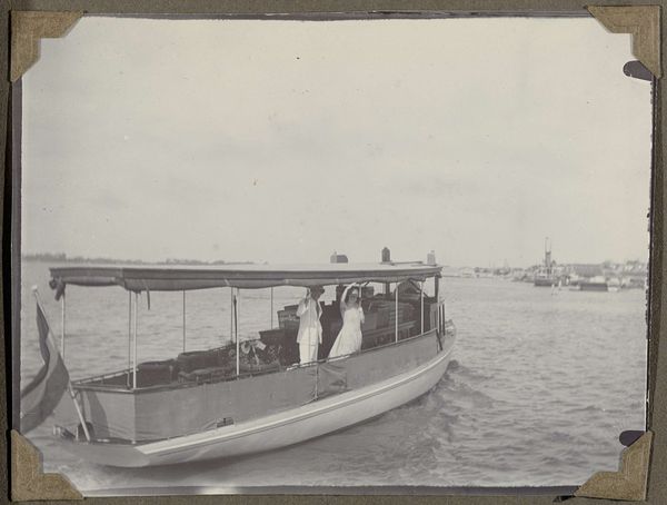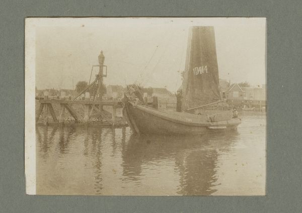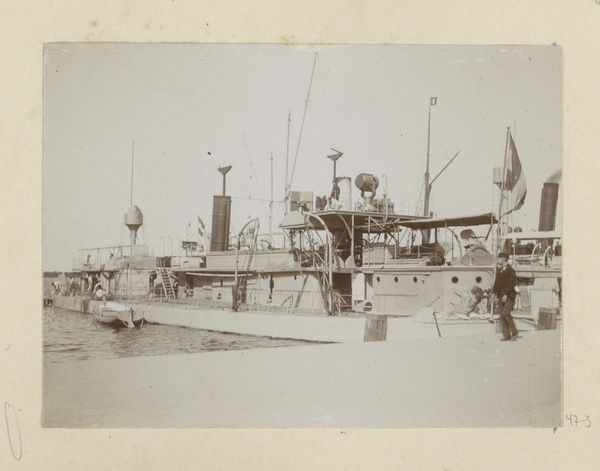 Editor: This is a photograph called "The faithful D.A.D." created before 1908 by Geldolph Adriaan Kessler, a gelatin-silver print held at the Rijksmuseum. The figures almost seem posed on the dock, next to this fascinating vessel. What catches your eye about this photograph? Curator: I'm interested in how the materiality of photography intersects with representations of labor and technology here. Gelatin-silver prints were becoming increasingly standardized at this time, enabling wider dissemination of images, thus reshaping visual culture itself. How does that affect this particular landscape? Editor: In what way would you say? Curator: Well, consider the juxtaposition of the presumably 'faithful' ferry against the backdrop of what appears to be a warship. What kind of labor produced each of these, and for what purpose? Is there a statement about shifting naval technologies or production inherent in juxtaposing them? Moreover, how is Kessler's labor – his act of photographic reproduction – implicated? Editor: So you’re saying it's not just a straightforward image but also a comment on industry and production through these different watercraft? Curator: Exactly! Consider the economic underpinnings allowing the existence of leisure boats as well as warships. It shows photographic practice capturing and contributing to this social landscape. Whose stories get told, and whose labor goes unseen? What gets valued, and what is rendered mundane through its widespread capture and consumption in printed images? Editor: That’s fascinating! I never would have considered it in those terms. Now I’m wondering about the kind of social circles involved in both their creation and circulation. Curator: Precisely. The beauty of examining a work through this lens is that it reveals not just the subject, but the complex web of social and economic relations that bring it into being. Editor: This makes me see photography as way more than just documentation. It's a whole system! Thanks for broadening my perspective.