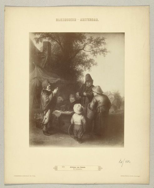 This is a photographic reproduction by Ch. Binger & Co. of a drawing of the Nieuwmarkt fair by Reinier Craeyvanger. Fairgrounds, such as the one we see here in Amsterdam, were places where social classes mixed, if only for a short time. They were spaces where conventional societal rules could be bent, if not broken. Consider the couple in the foreground; dressed in their finery, they represent the upwardly mobile middle class. This burgeoning class sought entertainment and leisure activities to reflect its status and to experience the pleasures of modern urban life. Meanwhile, the performers on the stage are separated not just by their elevated position, but by their occupation, marking them as distinct from the crowd. This image captures a moment in time, reflecting the shifting social dynamics and the emerging cultural landscape of 19th-century Amsterdam. It offers a glimpse into the lives of people navigating a rapidly changing world.