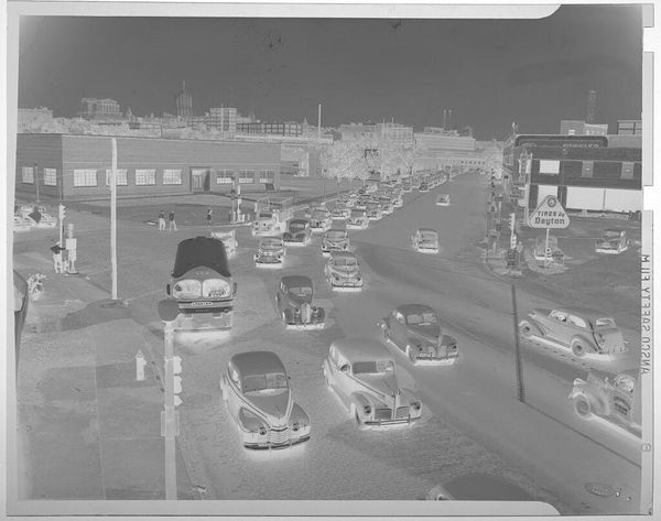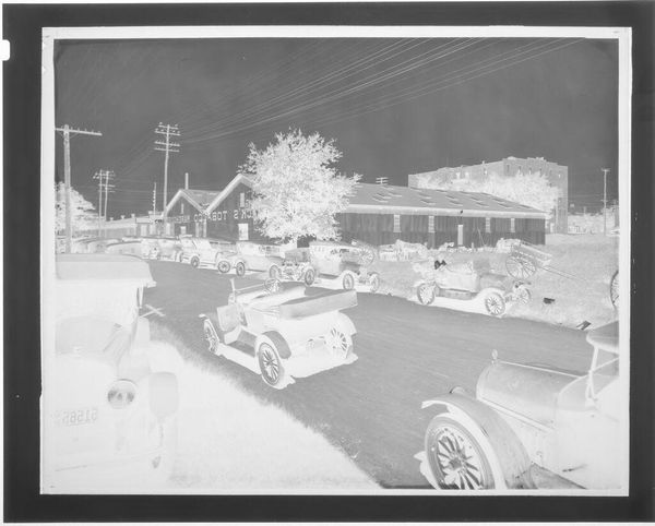 Curator: This photograph, currently titled "Untitled (men driving old car down city street)," is attributed to Jack Gould. It is part of the Harvard Art Museums collection and measures about 4 by 5 inches. What do you make of this scene? Editor: It's stark, like a negative. All the whited out areas make the road seem slick. Curator: The image does seem to capture a moment of transition in American life, perhaps rural communities adapting to the presence of the automobile. Note the Baker Sales Service store in the background. Editor: Yes, and look at the cars themselves. The older car on the left, almost skeletal in its design, contrasts with the streamlined model next to it. You can almost see the shift in production techniques. Curator: Absolutely. Considering this photograph's place within the larger context of documentary photography, it shows how ordinary life becomes material for art and historical record. Editor: The texture itself speaks of process. The photographic paper has a distinct materiality. It makes me think about how images are made and consumed. Curator: A compelling reminder that even seemingly simple snapshots have layers of meaning embedded within them. Editor: Agreed. It's a picture that makes you think about the past and how much labor went into constructing such objects.
